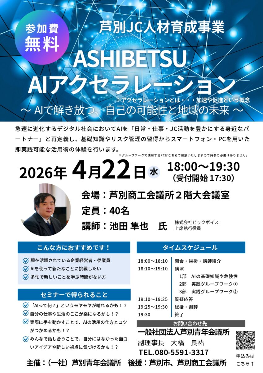 【4月22日開催・無料】芦別JC主催セミナー「ASHIBETSU AIアクセラレーション」~ AIで解き放つ、自己の可能性と地域の未来 ~