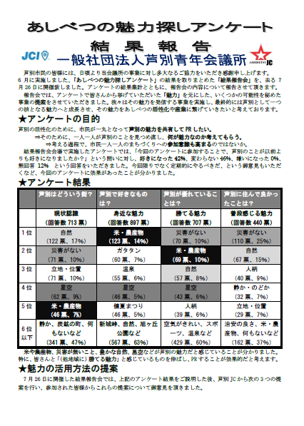 7月26日(日)に7月例会 市民と共にまちづくり~知の集結を目指して~ あしべつの魅力探しアンケート結果報告会を開催しました。当日は26名の市民の皆様にご参加い…