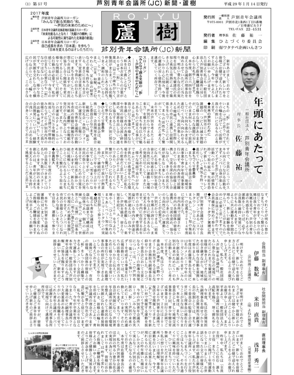 1月14日の新年交礼会当日に合わせ、私達芦別青年会議所を広く知っていただくために、芦別青年会議所広報新聞「蘆樹57号」を芦別市内一円に新聞折込にて配布させて頂き…