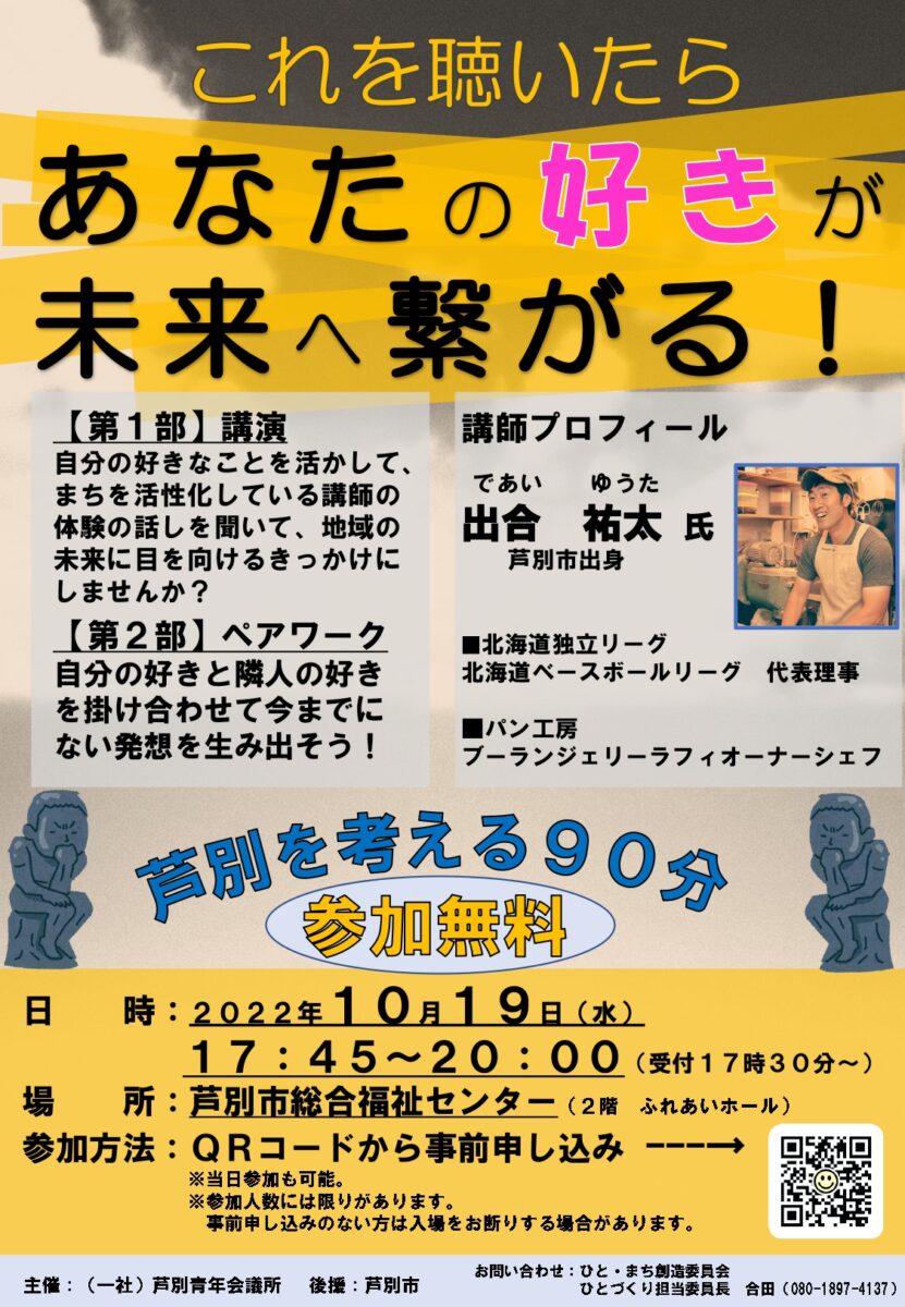 これを聴いたら、 あなたの好きが未来へ繋がる! 芦別を考える90分! 自分の好きなことを活かしてまちを活性化している 講師の体験の話を聞いて、 地域の未来に目を…