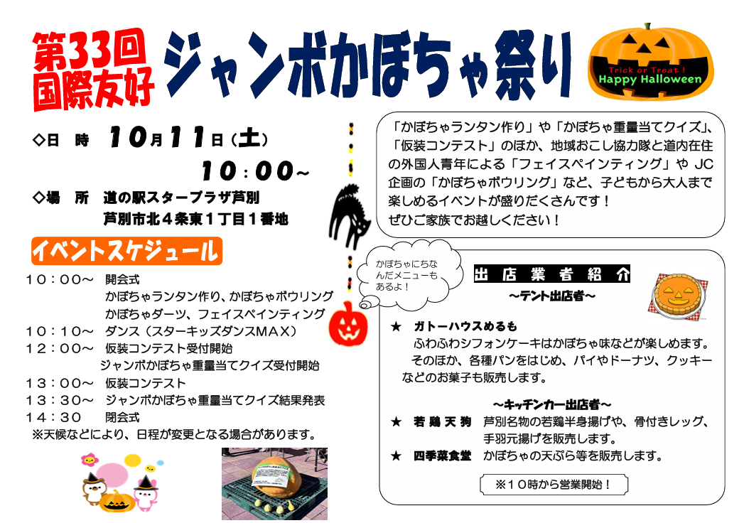トリックオアトリート! ひとづくり委員長の髙瀬です(^_-)-☆ 明日、11日に 第33回国際友好ジャンボかぼちゃ祭り が、道の駅で開催されます! …