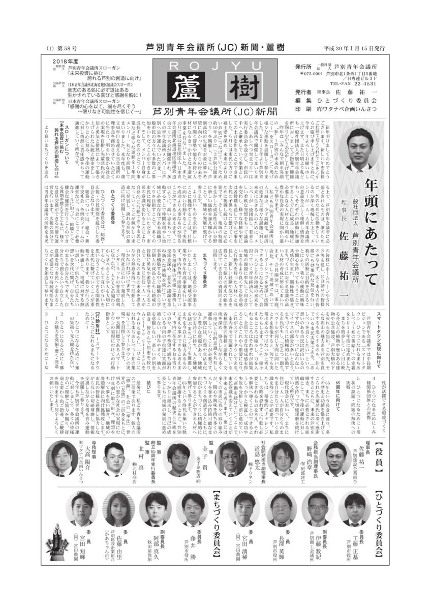 今年度、我々は『「全員主役」〜ここに住む 誰もが主役 まちづくり〜』をスローガンに掲げ、芦別の発展のためにメンバー一丸となって邁進してまいりますのでご指導、ご鞭撻を賜りますよう何卒よろしくお願い申し上げます。