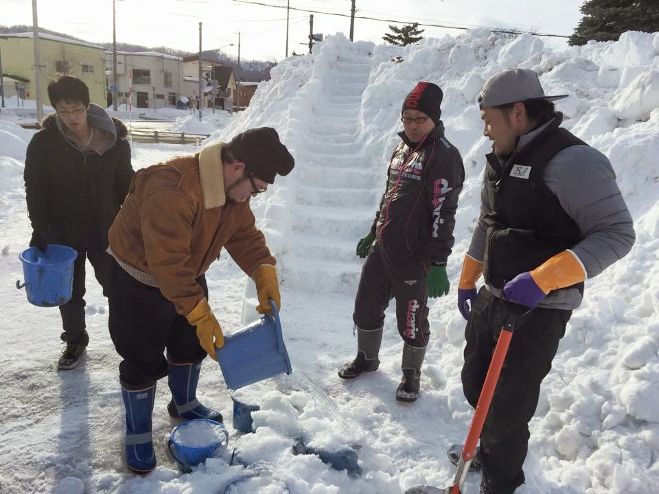 子どもたちの冬の遊びといえば、なんといっても雪のすべり台! 昨年同様、会場に巨大なすべり台を作成中です。