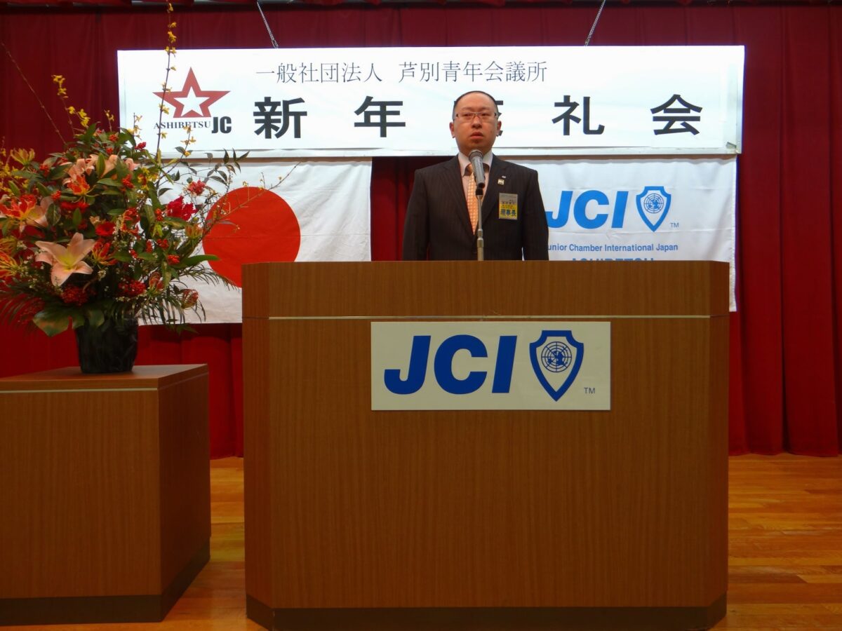 1月12日(月)、芦別温泉スターライトホテル2階天の川において、第4回定時総会を開催しました。はじめに新旧理事長のバッヂ交換が行われ、その後、奥原理事長よりメンバーに向けて挨拶がありました。続いて、今年入会した3名の新入会員に対してバッジ授与を行い、それぞれから決意や抱負を述べて頂きました。